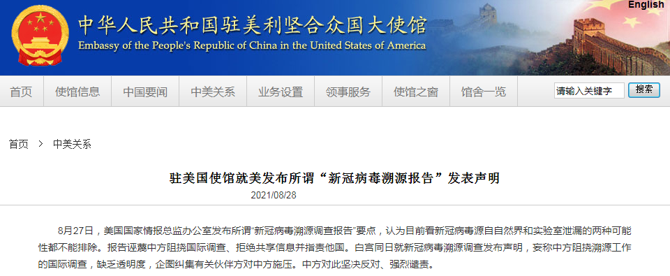 当地时间8月27日,美国情报总监办公室发布了所谓的“新冠病毒溯源调查报告”的摘要,认为目前看新冠病毒源自自然界和实验室泄漏的两种可能性都不能排除,同时诬蔑中方阻挠国际调查、拒绝共享信息并指责他国。对此,中方表示坚决反对、强烈谴责。8月28日,中国外交部副部长马朝旭在接受央视总台记者专访时表示,已经就此问题向美方提出严正交涉。此番美国发布的病毒溯源报告,其实是拜登5月份下令其情报部门调查新冠病毒溯源的必然结果。不让科学家组织或者科学机构而是由情报部门来进行病毒溯源,本就是咄咄怪事。如此美国式病毒溯源,注定只是一场闹剧。自新冠疫情暴发以来,病毒溯源问题就一直广受关注,包括中国在内的全球相关权威科研机构,付出极大努力进行调查研究,但至今并未得出确切结论。这说明了病毒溯源工作的复杂性,美国情报部门仅用90天又怎能得出令人信服的结论?其匆忙发布的“报告”,显然只能是贻笑大方。其实,由情报部门进行溯源,其初衷就是为了政治操纵,并非要得出科学结论。事实也是如此,此次报告得出的结论就是没有结论,唯一的“新”发现,就是新冠病毒不可能是为了生物武器而设计出来的。病毒溯源是全球合作抗疫的必要环节,溯源结果关乎全球抗疫大局,大意不得也马虎不得。对此,除了依靠科学家们的专业精神和有效合作,没有别的捷径可走。借病毒溯源问题搞政治操纵,是对国际社会的不负责任,更是在给全球合作抗疫添乱添堵。▲当地时间8月28日,中国驻美国使馆就美发布所谓“新冠病毒溯源报告”发表声明。