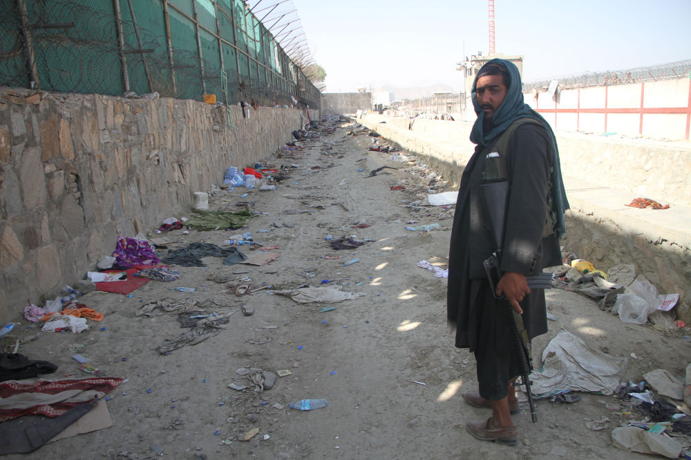8月27日,一名阿富汗塔利班人员站在喀布尔机场附近的爆炸现场。(新华社发,塞夫拉赫曼·萨菲摄)