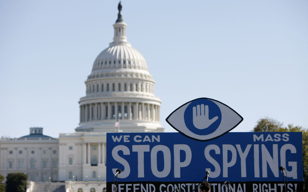 2013年10月26日,在美国首都华盛顿,一块反监控的大型标语牌竖立在国会大厦前。当日,数百名民众在华盛顿参加示威活动,抗议美国家安全局针对普通美国民众的大规模监控活动。(新华社记者方喆摄)