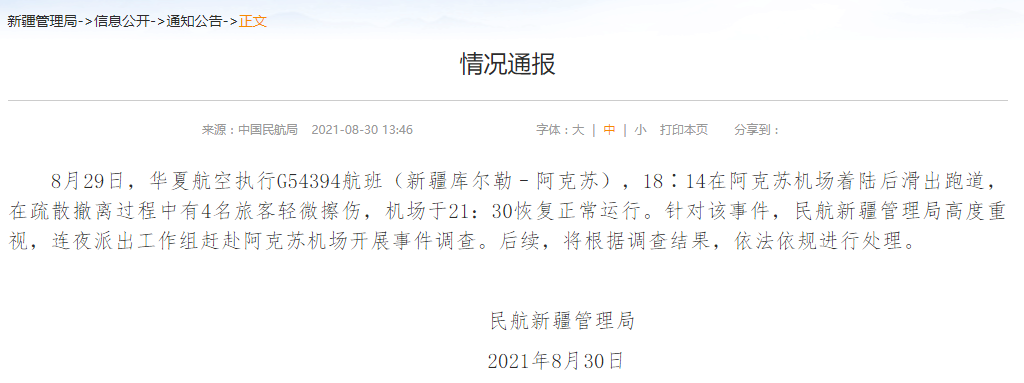 新京报快讯 据民航新疆管理局官网消息,8月29日,华夏航空执行G54394航班(新疆库尔勒–阿克苏),18∶14在阿克苏机场着陆后滑出跑道,在疏散撤离过程中有4名旅客轻微擦伤,机场于21:30恢复正常运行。针对该事件,民航新疆管理局高度重视,连夜派出工作组赶赴阿克苏机场开展事件调查。后续,将根据调查结果,依法依规进行处理。