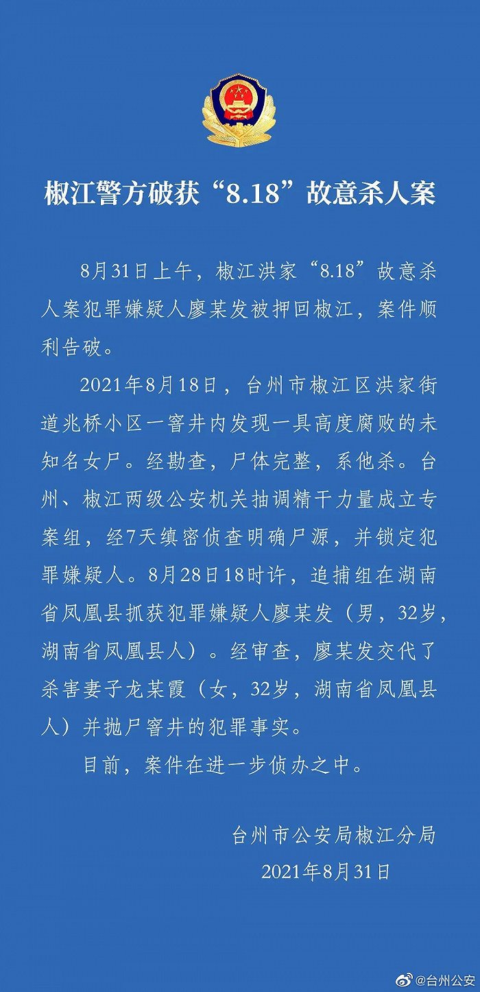 新京报快讯 据@台州公安微博通报,浙江台州椒江警方破获洪家“8.18”故意杀人案。通报如下: