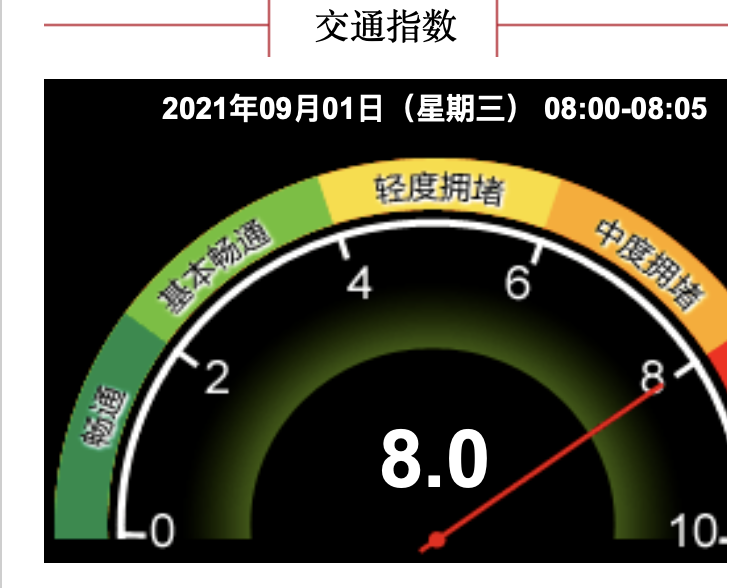 记者从北京市交通委官网了解到,今早8时,北京市交通指数就跃升至8.0,达到了严重拥堵级别,而此前很长一段时间,交通指数始终保持在7.5以上,属于中度拥堵级别中的较高水平。