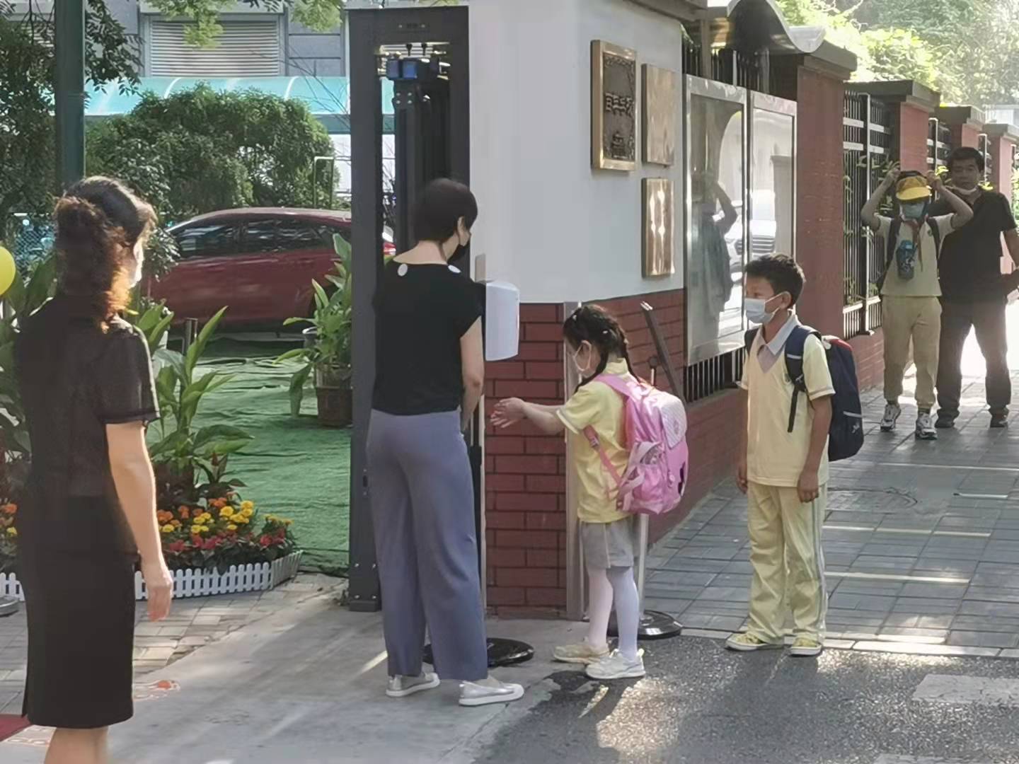 西单小学一名教师告诉新京报记者,今早7点30分左右就有学生陆续入校。学校在校门口设置洗手装置,每个学生进入校园前先洗手消毒,随后通过红外线测温通道,同时还有查验身份的环节。记者看到红外线测温通道出口处有身穿白大褂的校医院工作人员,老师称,“如果有体温异常的,会有校医立即采取相关措施。”