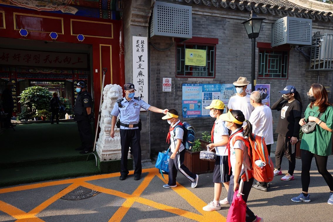9月1日早上,东城公安分局共投入警力200余人分散在区内各个学校守护校园安全,图为民警在黑芝麻胡同小学引导学生进校。东城公安分局供图