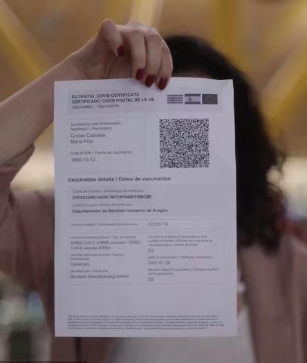 ▲当地时间2021年7月1日,西班牙马德里,一名妇女展示欧盟数字新冠通行证。图/IC photo