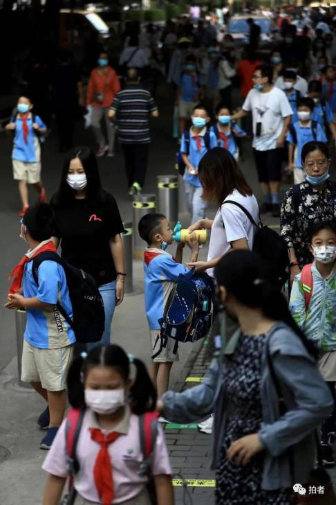 9月1日,北京各中小学校的同学们迎来了新学期。140万学生迎着初秋的朝阳,在家长的护送下,戴着口罩进入校园。