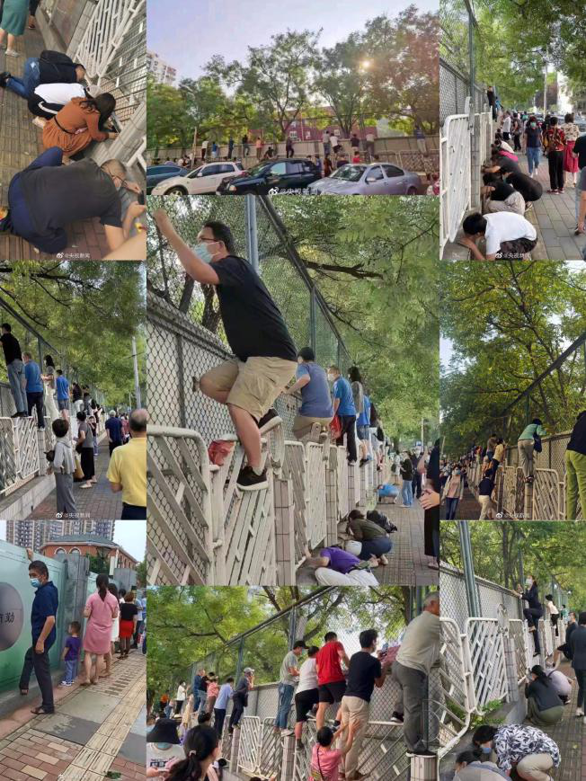 有人爬上围墙或者透过栏杆“见缝插针”式观察,