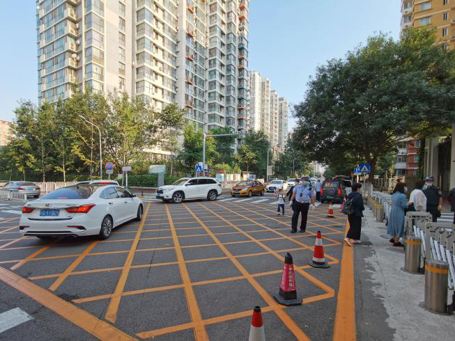 北京市公安局内保局基础工作大队副大队长刘妍告诉新京报记者,今早7点20分左右,她就和同事来到开学现场进行安全检查和秩序维护。刘妍介绍,今早开学入校期间,校门口的防护栏和隔离带全部放置好,起到封闭化管理的作用。