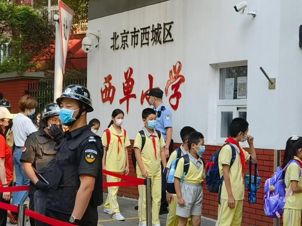9月1日一早,民警来到西单小学门口执勤,确保学生们顺利安全进入学校。北京市公安局供图
