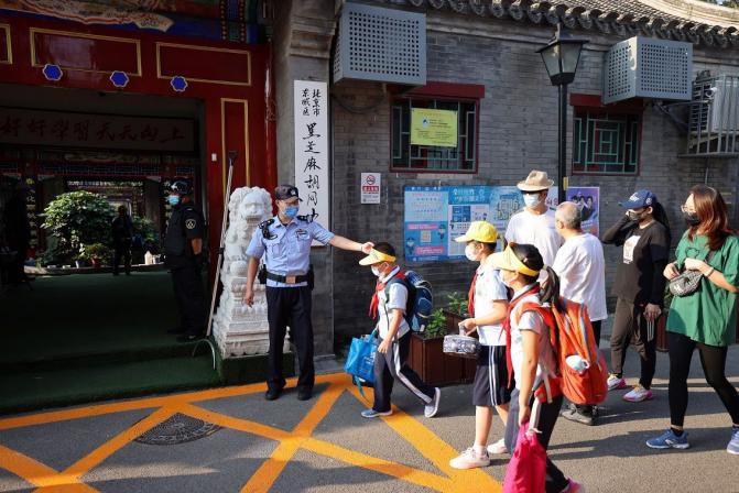 9月1日早上,东城公安分局共投入警力200余人分散在区内各个学校守护校园安全,图为民警在黑芝麻胡同小学引导学生进校。东城公安分局供图