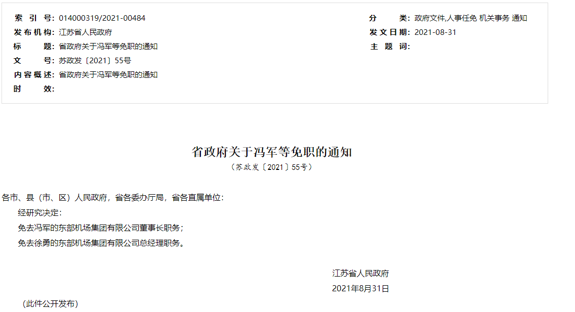 东部机场集团董事长冯军、总经理徐勇被免职