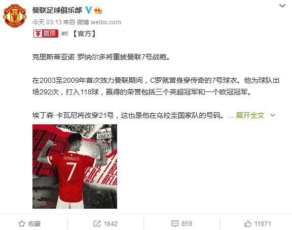 曼联官宣C罗仍披7号战袍。网络截图