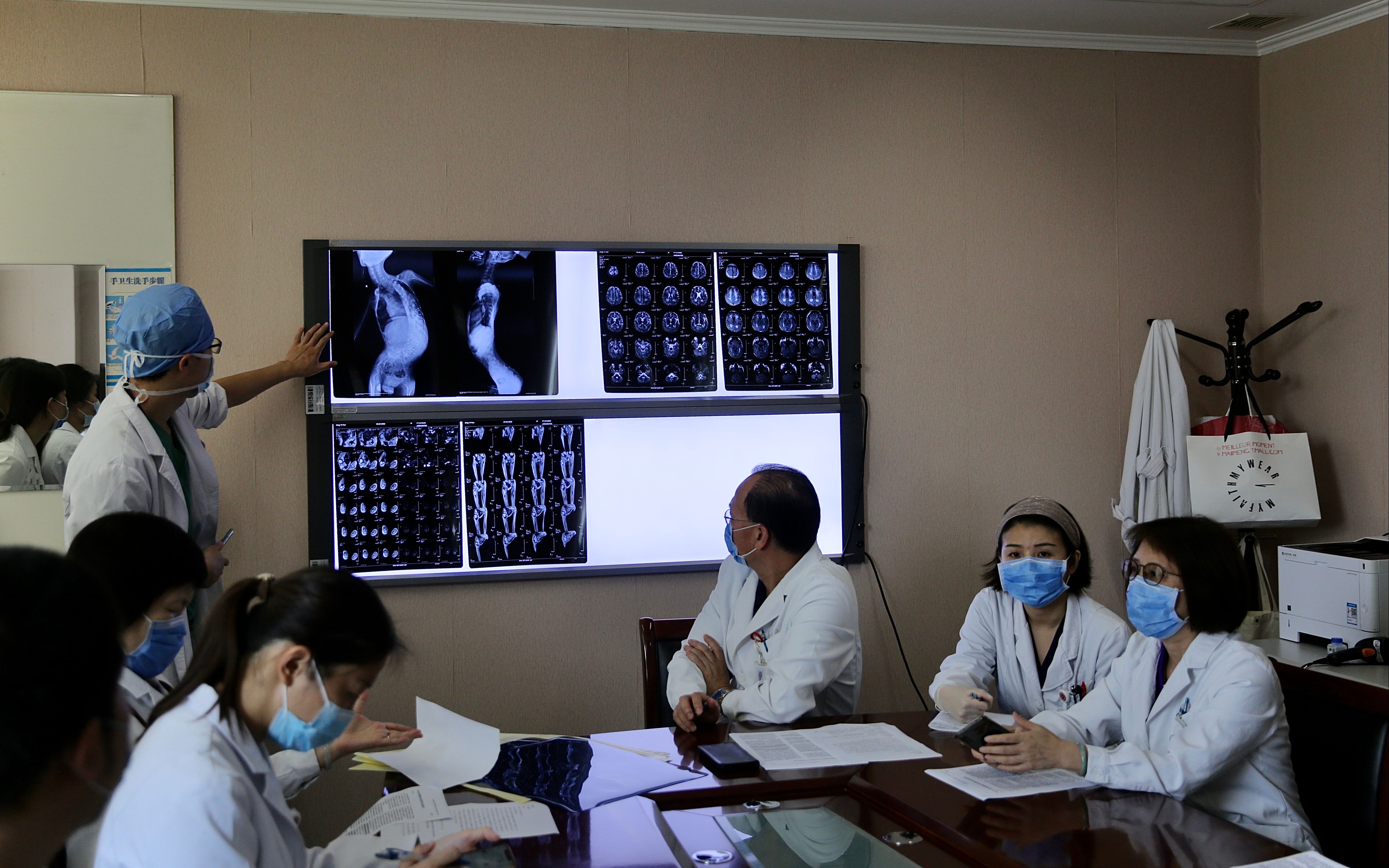 北大医院组织的会诊中,父母托着小凡的头,帮他减少脊椎压力。