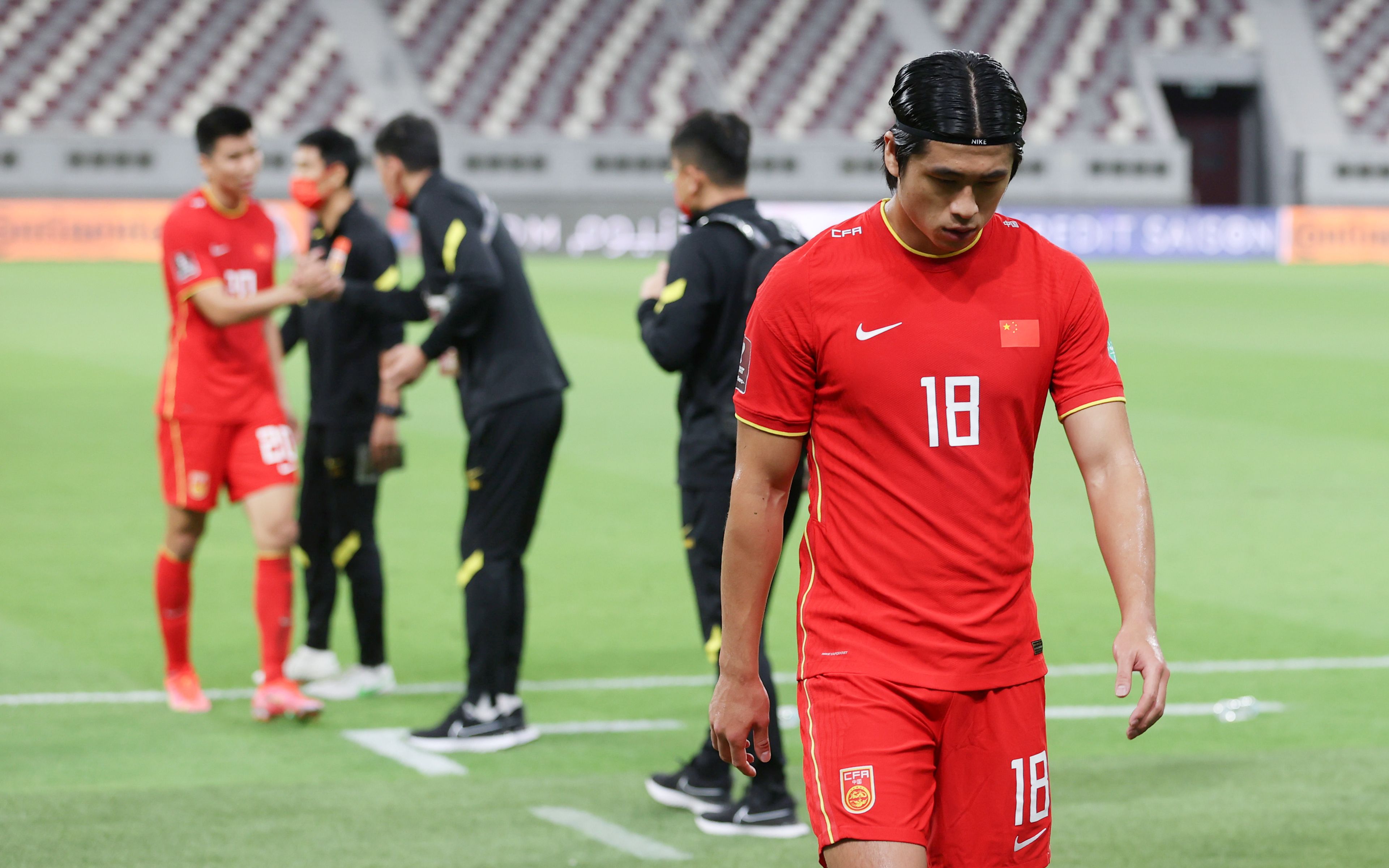 张玉宁(右一)在比赛后离场。图/新华社
