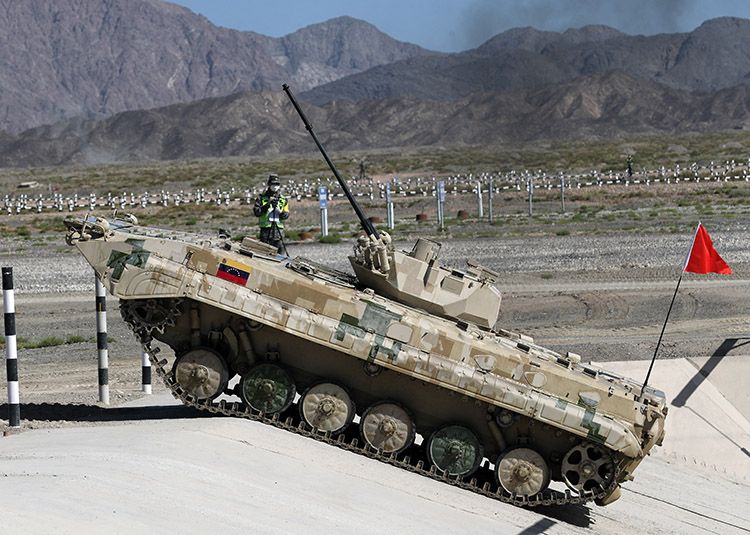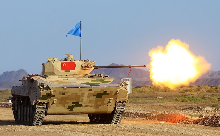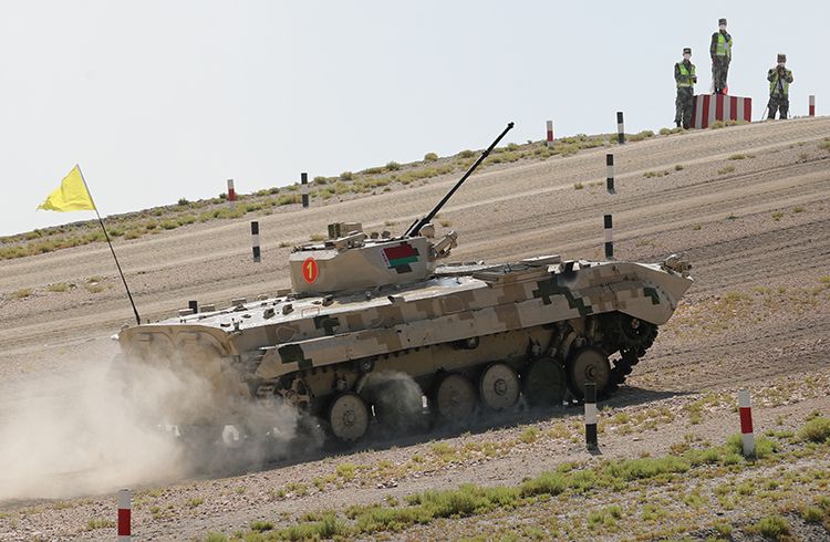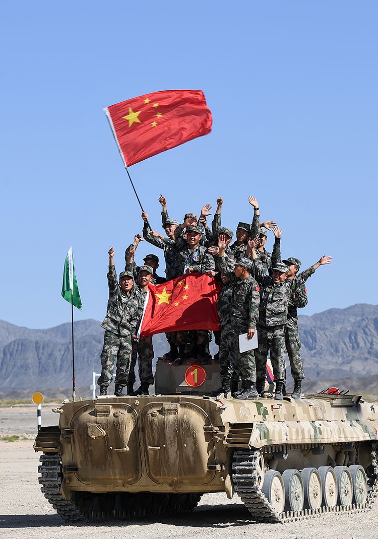 “苏沃洛夫突击”接力赛集驾驶、射击、通信于一体,综合考核主战装备的总体作战性能和乘载员的技战术水平。每支参赛队3个车组使用同一辆步战车,在长度4.3公里的闭合赛道上接力行驶12圈,累计通过132个障碍,每个车组还要对4类8个目标进行射击。最终,中国参赛队用时1小时8分23秒68,取得“苏沃洛夫突击”接力赛第一名,创历史最好成绩,俄罗斯、白俄罗斯分别以1小时24分55秒92、1小时36分33秒48的成绩位列第二、第三名。图为:中国参赛队车组进行侧向射击。