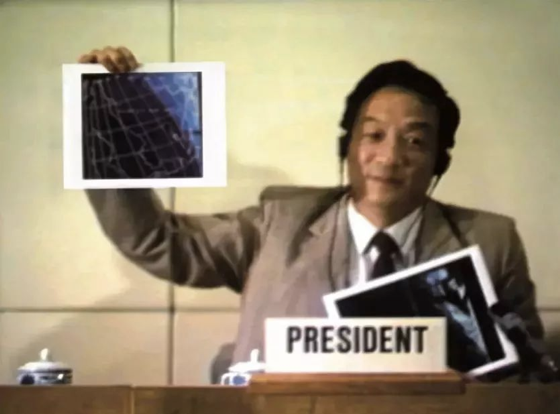 △1988年,时任世界气象组织主席、中国气象局局长邹竞蒙向与会议代表展示我国第一颗极轨气象卫星观测的首张云图。