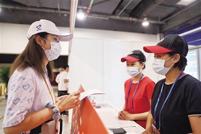 在2021年服贸会上,一群白衣年轻人活跃于国家会议中心和首钢园的各个角落。他们的服装上印着中国青年志愿者的统一标志——“心手标”,每当遇到来寻求帮助的人,他们就会伸出援手,协助工作人员保障服贸会顺利进行。