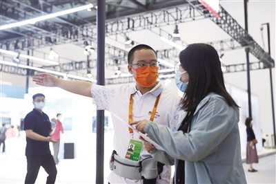 9月5日,国家会议中心,数字专区引导志愿者刘英杰正为参观者进行指引。新京报记者 王飞 摄