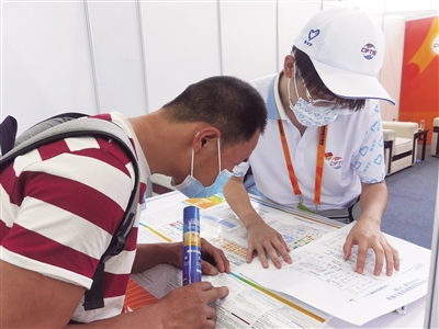 在首钢园教育服务展区前台,中央民族大学的阎婧涵忙个不停,她不仅要为参观者提供路线指引、发放场内导览图和消毒用品,还不忘提醒大家做好防疫、戴好口罩。