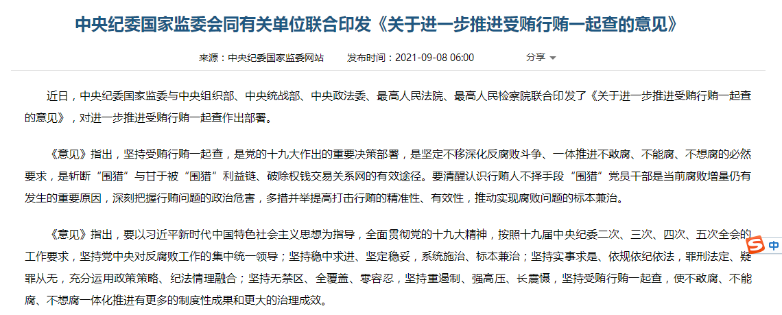 ▲近日,中央纪委国家监委会同有关单位联合印发《关于进一步推进受贿行贿一起查的意见》。图/中央纪委国家监委网站截图