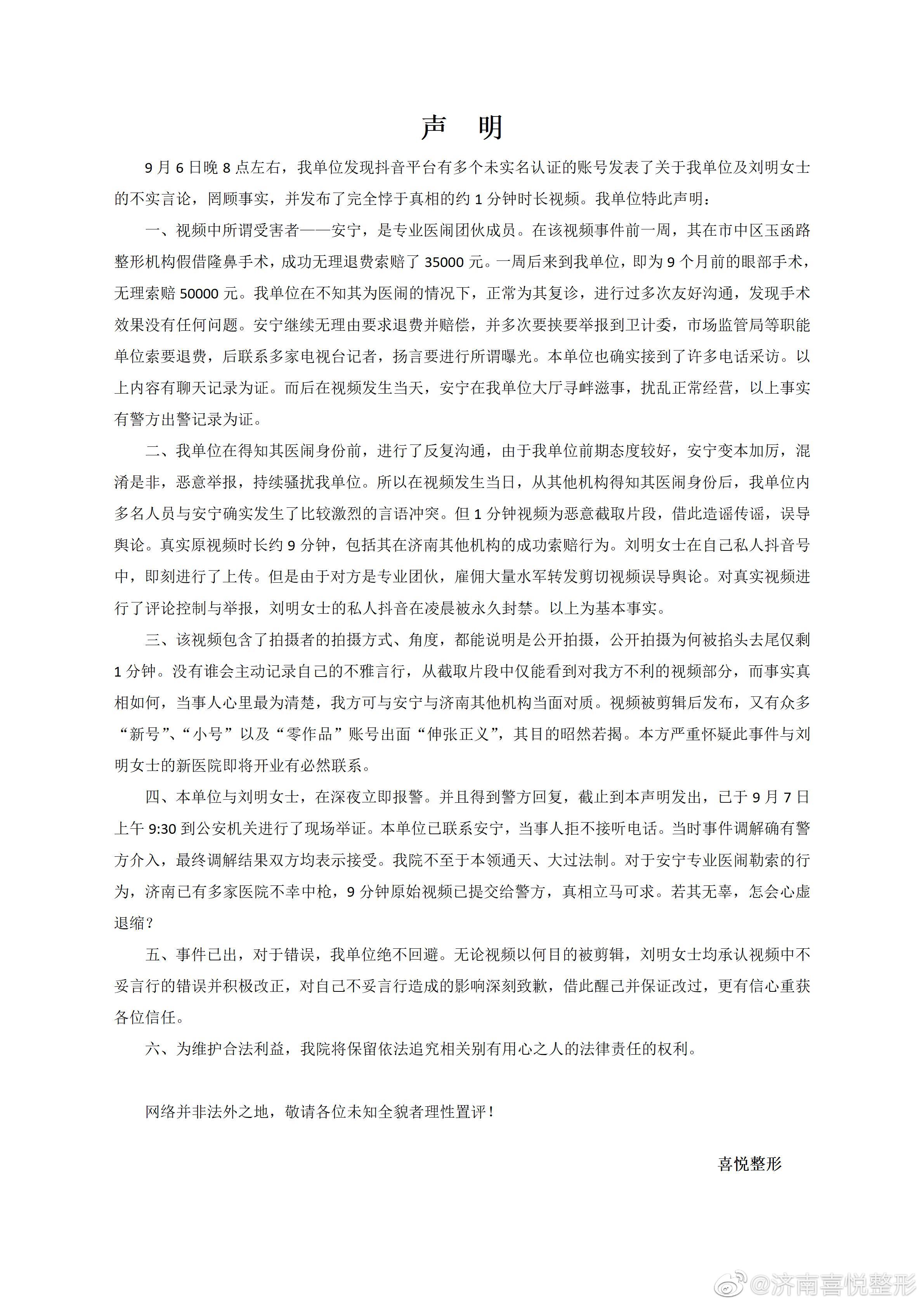 ▲9月7日晚,济南喜悦整形发表声明称爆料视频为不实言论,罔顾事实。图/济南喜悦整形微博