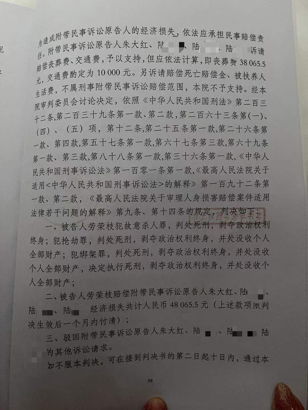 代理律师刘静洁表示,朱大红一方对于判决结果很满意,至于附带民事赔偿部分,朱大红一方将不上诉,二审不再参加。刘静洁表示,判决赔偿48000余元,想弥补陆中明家的损失远远不够,“对于劳荣枝的宣判,体现了法律的公正,但被害人受到了伤害却得不到应有的赔偿。”