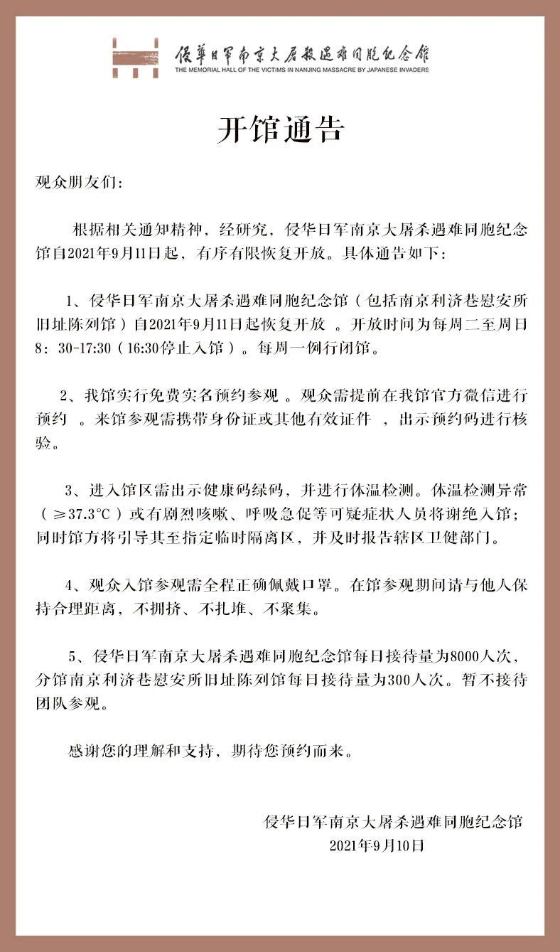 侵华日军南京大屠杀遇难同胞纪念馆9月11日起恢复开馆