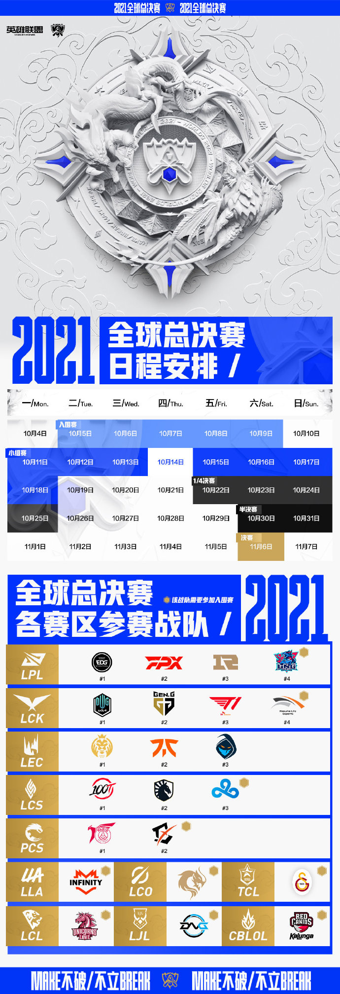 S11共分入围赛、小组赛和淘汰赛三个阶段。按照赛程,入围赛将于10月5日率先打响,包含LPL(英雄联盟职业联赛)赛区四号种子LNG战队在内的10支队伍将共同争夺4个晋级名额。
