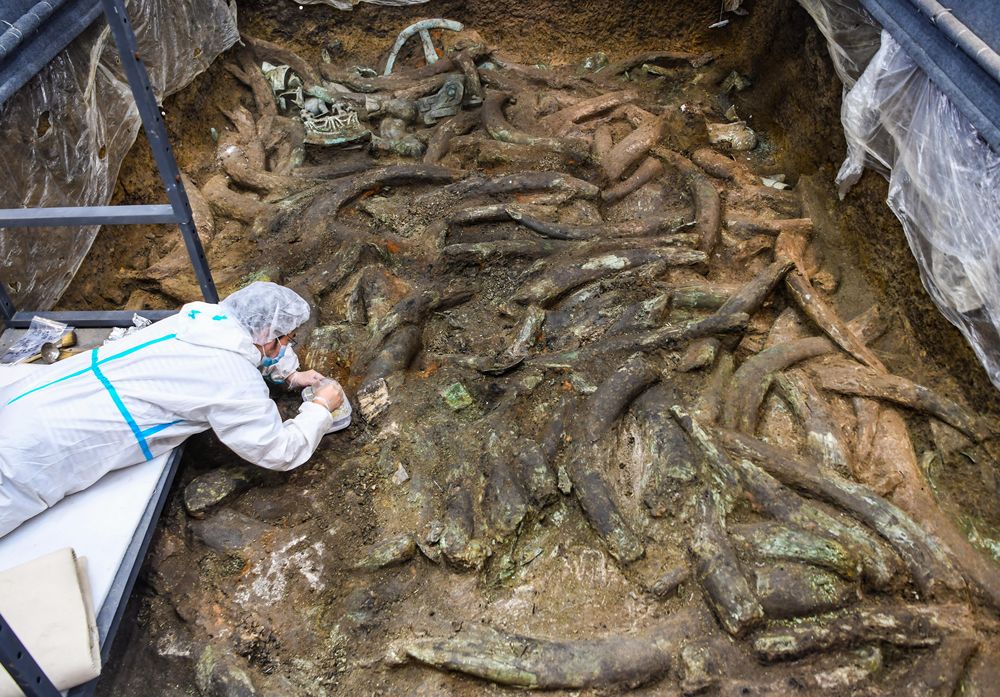 此外,8号“祭祀坑”还发现了见证中原文明和古蜀文明交融的朱砂彩绘青铜尊、面部彩绘的青铜人头像等。