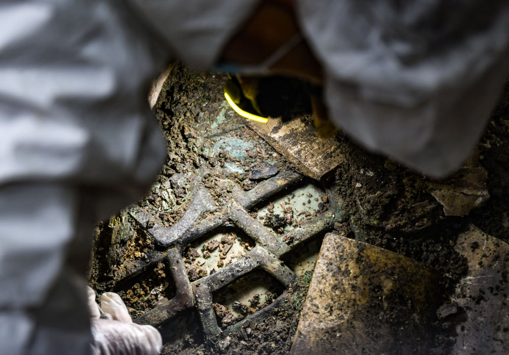 甚至还有好几件前所未见的玉器。其中一件还未完全出土的葱绿色“玉板”很有特色,看起来它镶嵌在一块镂空的青铜网格之中,形态非常罕见。商周时期称青铜为“吉金”,黎海超说:“这件首次发现‘金镶玉’,还需要进一步发掘确认最终形态。”