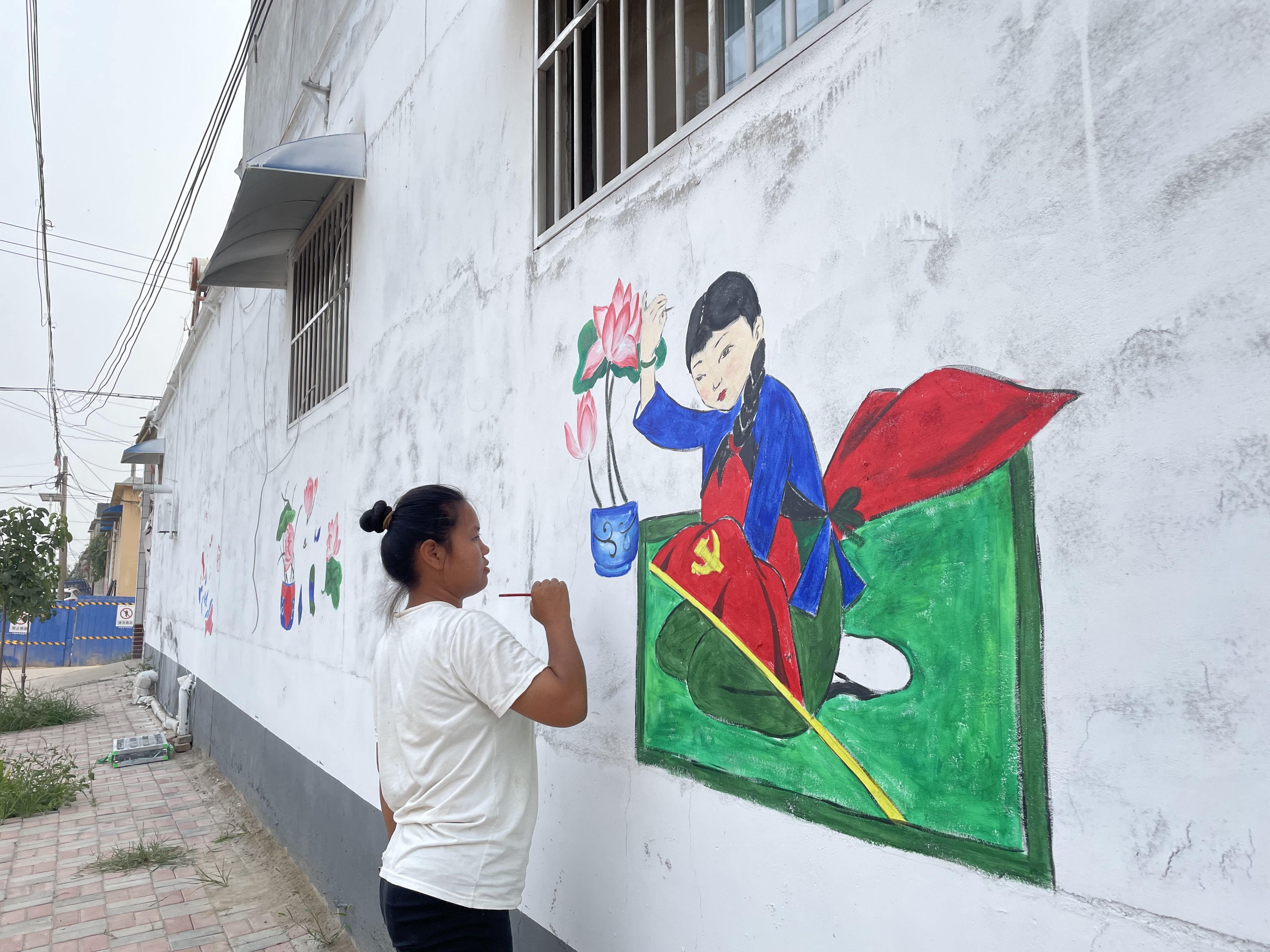 刘师的家住在河北省石家庄市藁城区梅花镇梅花村,目前她已经在西白露村、土山村等周边村镇进行墙绘,主题大多是为正能量等宣传内容,近日,刘师在土山村创作的是心向党等主题墙绘。刘师表示,村民也都比较愿意让在自家墙上作画。