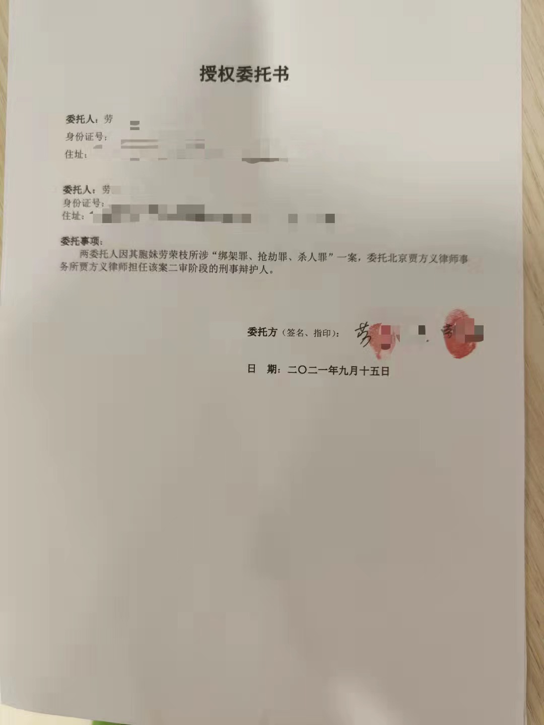 由上述律师提供的授权委托书中显示,9月15日,劳荣枝的二哥与姐姐签名并按手印,委托北京贾方义律师事务所主任律师贾方义、北京德和衡律师集团(上海分所)专职律师郭乘希为该案二审阶段的刑事辩护人。9月17日,郭乘希告诉新京报记者,昨天下午已经把委托手续按照法律规定寄给南昌中院。