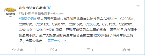新京报快讯 据北京南站官方微博消息,受大风天气影响,9月20日北京南站始发列车C2561次、C2005次、C2007次、C2011次、C2607次、C2615次、C2605次、C2013次、C2203次、C2613次、C2019次临时停运。已购买停运列车车票的旅客,可于30日内办理全额退票手续。请广大旅客及时关注车站公告或登录12306网站了解列车停运情况,合理安排出行时间。