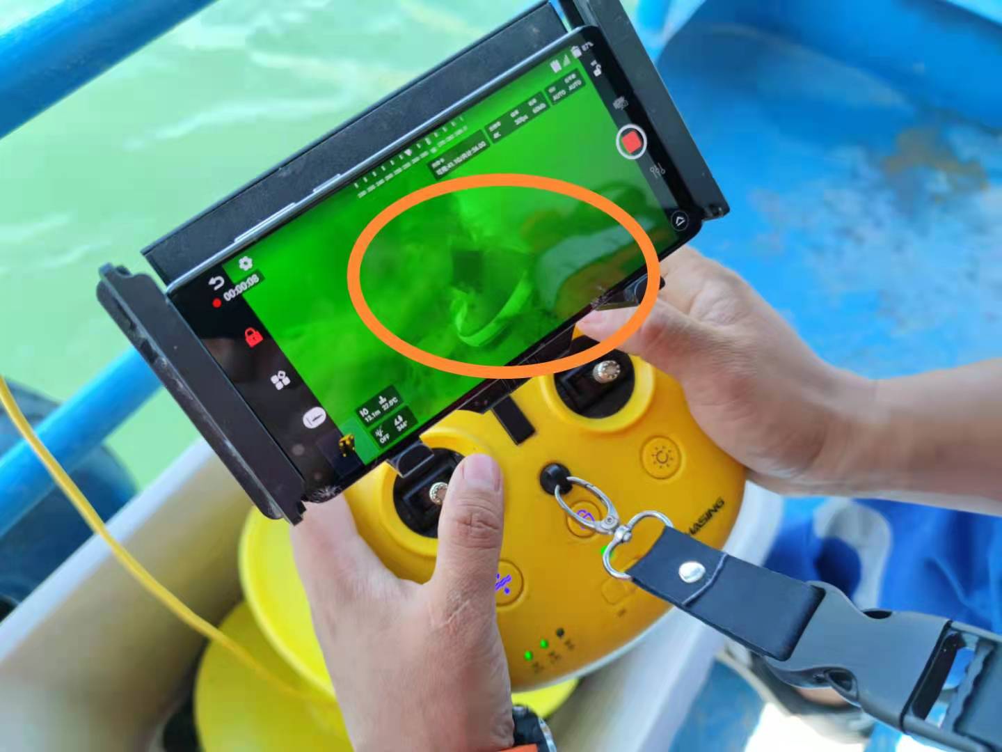 新京报记者从水下无人机实时画面看到,水下情况可在手机端屏幕清晰显示,能看到水草、鱼等。翟轲称,当用设备在水下看到人形物时,会派救援队员下水确认是否为失联人员。
