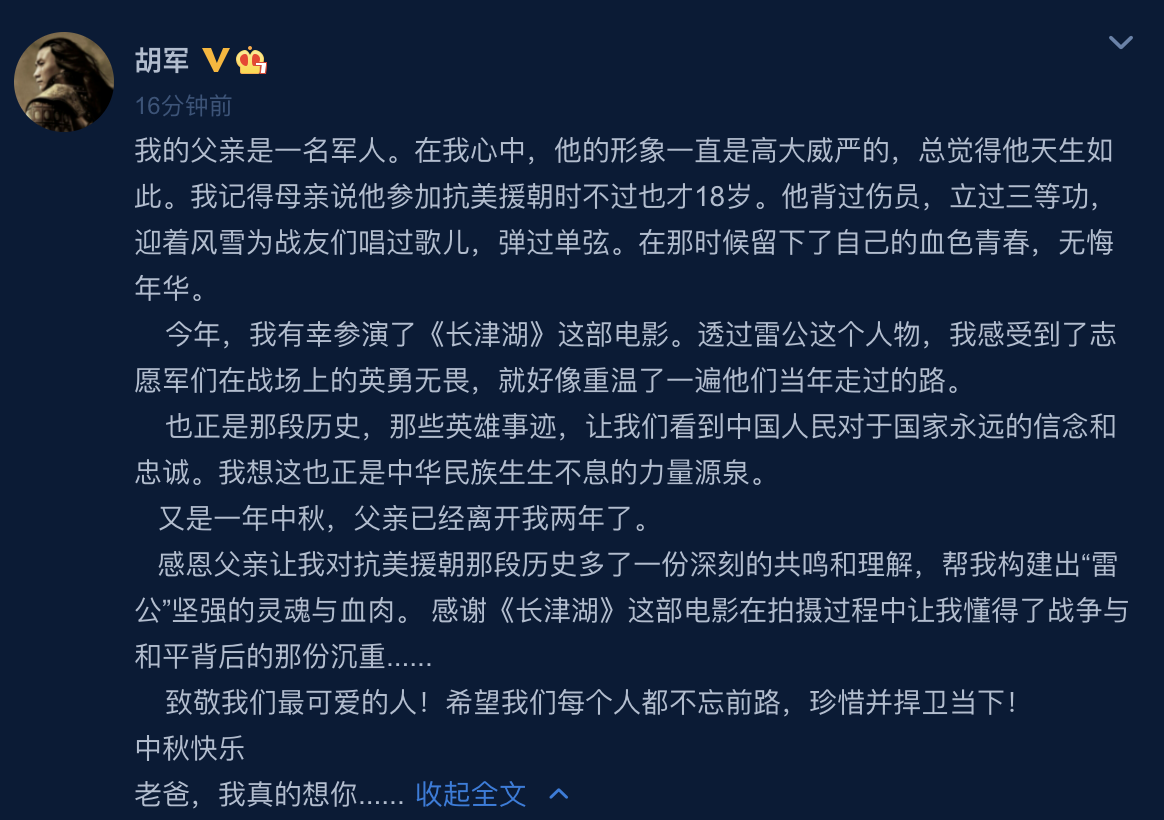 胡军发文怀念父亲:参演《长津湖》像重温一遍他们当年走过的路