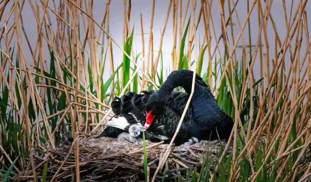 2020年60余只天鹅来怀柔过冬。让鲁颖彤印象深刻的是,今年3月,怀柔区的居民,纷纷在朋友圈转发了“怀柔籍”小黑天鹅破壳而出的视频。在怀河的芦苇岸边,2只成年黑天鹅40多天陆续孵出了5只小黑天鹅。