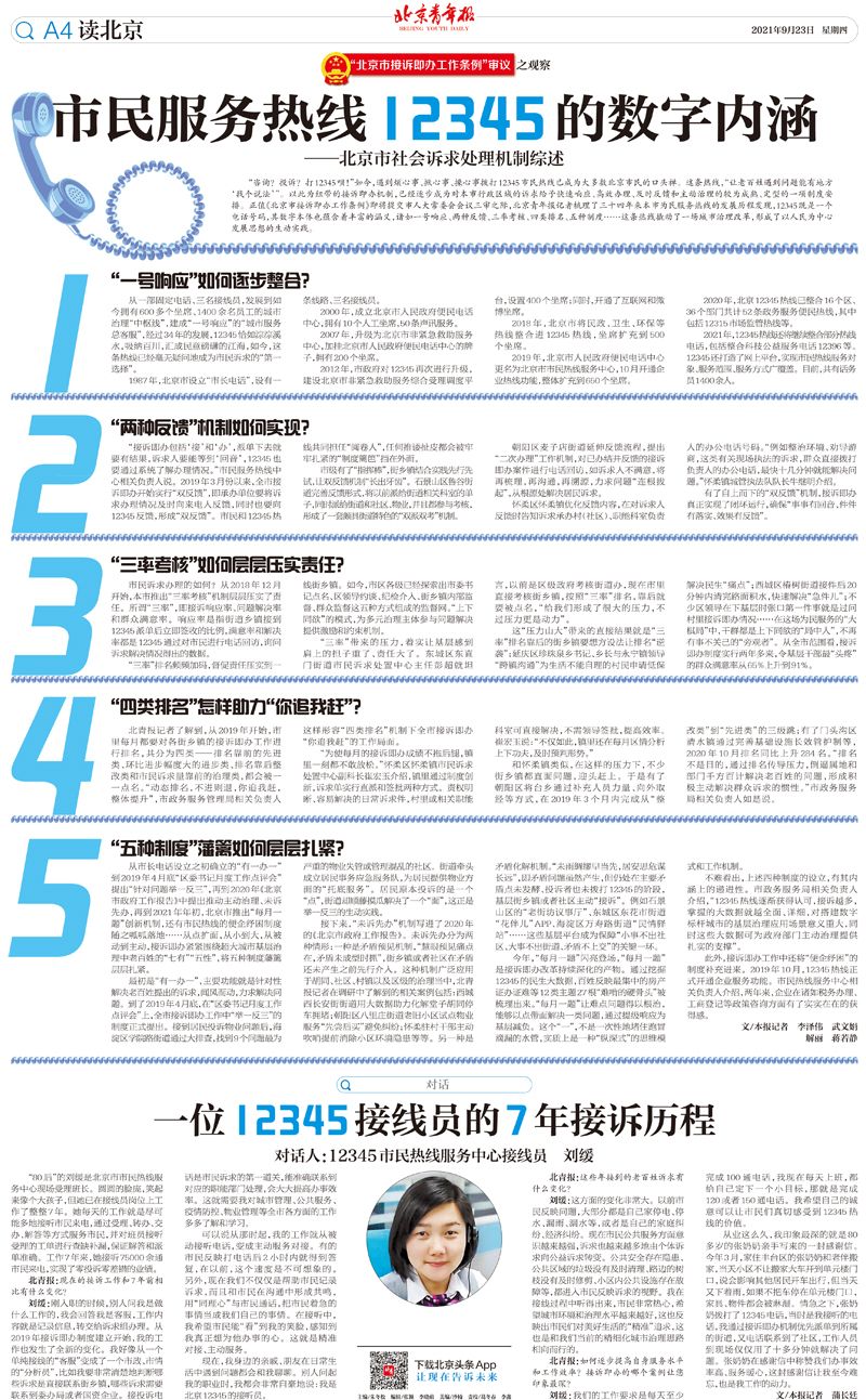 “咨询?投诉?打12345呗!”如今,遇到烦心事、揪心事、操心事拨打12345市民热线已成为大多数北京市民的口头禅。这条热线,“让老百姓遇到问题能有地方‘找个说法’”。以此为纽带的接诉即办机制,已经逐步成为对本市行政区域的诉求给予快速响应、高效办理、及时反馈和主动治理的较为成熟、定型的一项制度安排。正值《北京市接诉即办工作条例》即将提交市人大常委会会议三审之际,北青-北京头条记者梳理了三十四年来本市为民服务热线的发展历程发现,12345既是一个电话号码,其数字本体也蕴含着丰富的涵义,诸如一号响应、两种反馈、三率考核、四类排名、五种制度……这条热线撬动了一场城市治理改革,形成了以人民为中心发展思想的生动实践。