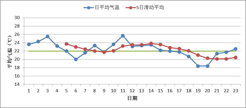 中华人民共和国气象行业标准——《气候季节划分》规定:基于当年气温序列计算5天滑动平均气温构成滑动平均气温序列。当年五日滑动平均气温序列连续5天小于22℃,则以其所对应的当年气温序列中第一个小于22℃的日期作为秋季起始日,如果初次判断的起始日期比常年偏早15天以上,需进行起始日的二次判断。