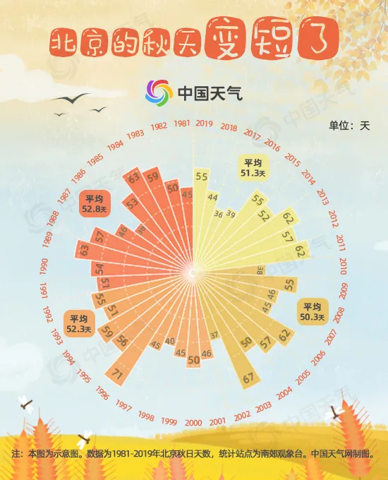 上世纪八十年代,北京的秋天平均为52.8天,九十年代为52.3天;到了2001年至2010年秋日平均长度缩短为50.3天,为平均值最短的十年,2011年以来秋日长度有所增加,平均值为51.3天,但仍比上世纪八九十年代有所缩短。