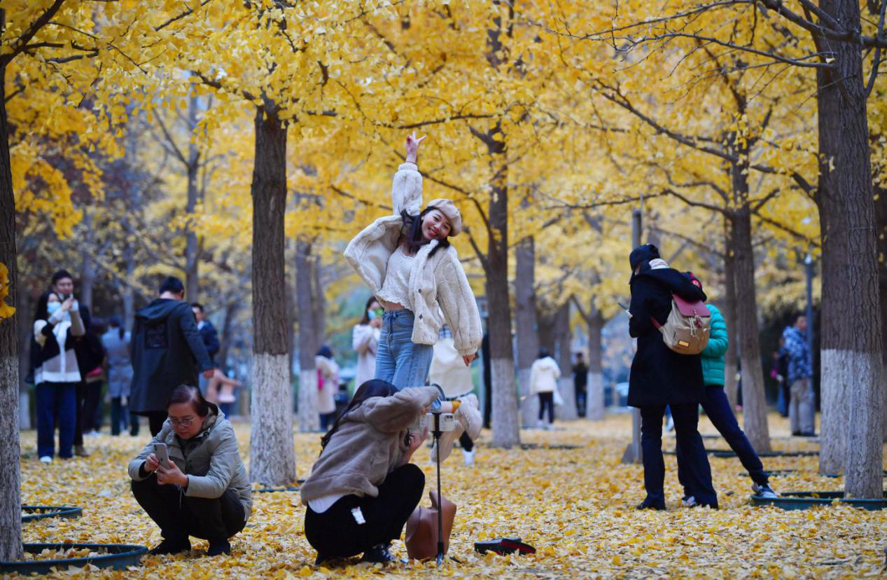 2020年11月14日,地坛公园东门银杏林,前来拍照打卡的市民络绎不绝。虽然天气阴冷,但不少市民依然前往地坛公园在秋天即将落幕的时节感受深秋的尾巴。在地坛公园银杏大道和东门外的银杏林,金灿灿的银杏叶依然耀眼,拍照赏秋的市民络绎不绝。新京报记者 李木易 摄
