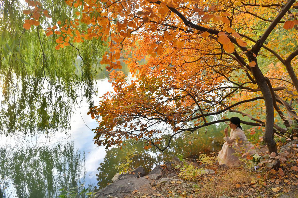 2020年10月28日,北京大学,一名女生在未名湖畔远眺美景。深秋已至,北京大学校园内也染上了浓浓的深秋色彩,秋天里的未名湖、静园、燕南园金黄火红灼烧着绿色,片片落叶在风中轻舞。新京报记者 李木易 摄