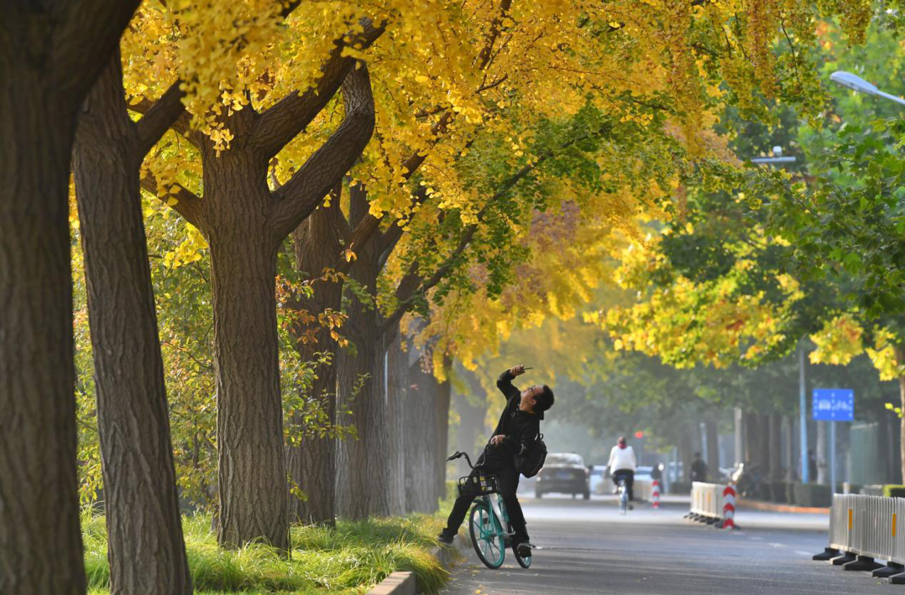 2020年10月26日,东直门外大街,一名骑车的市民在拍摄金灿灿的银杏树林。新京报记者 李木易 摄