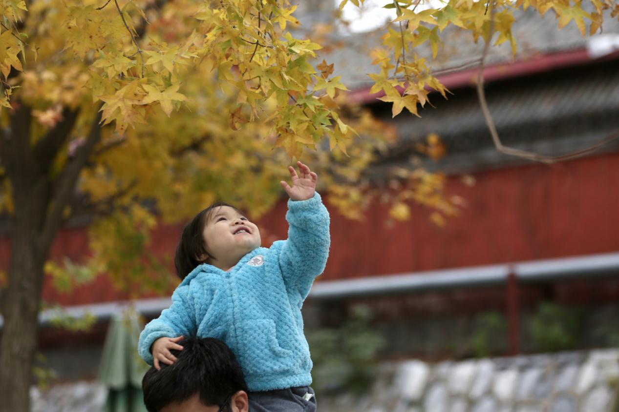 2019年11月16日,北京市西城区天宁1号文化科技创新园内,一名坐在爸爸肩上的小女孩伸手摘树上的黄叶。新京报记者 郑新洽 摄