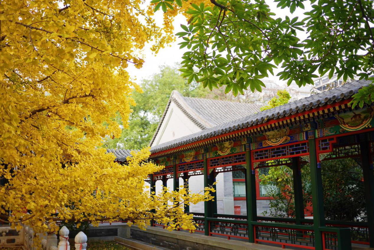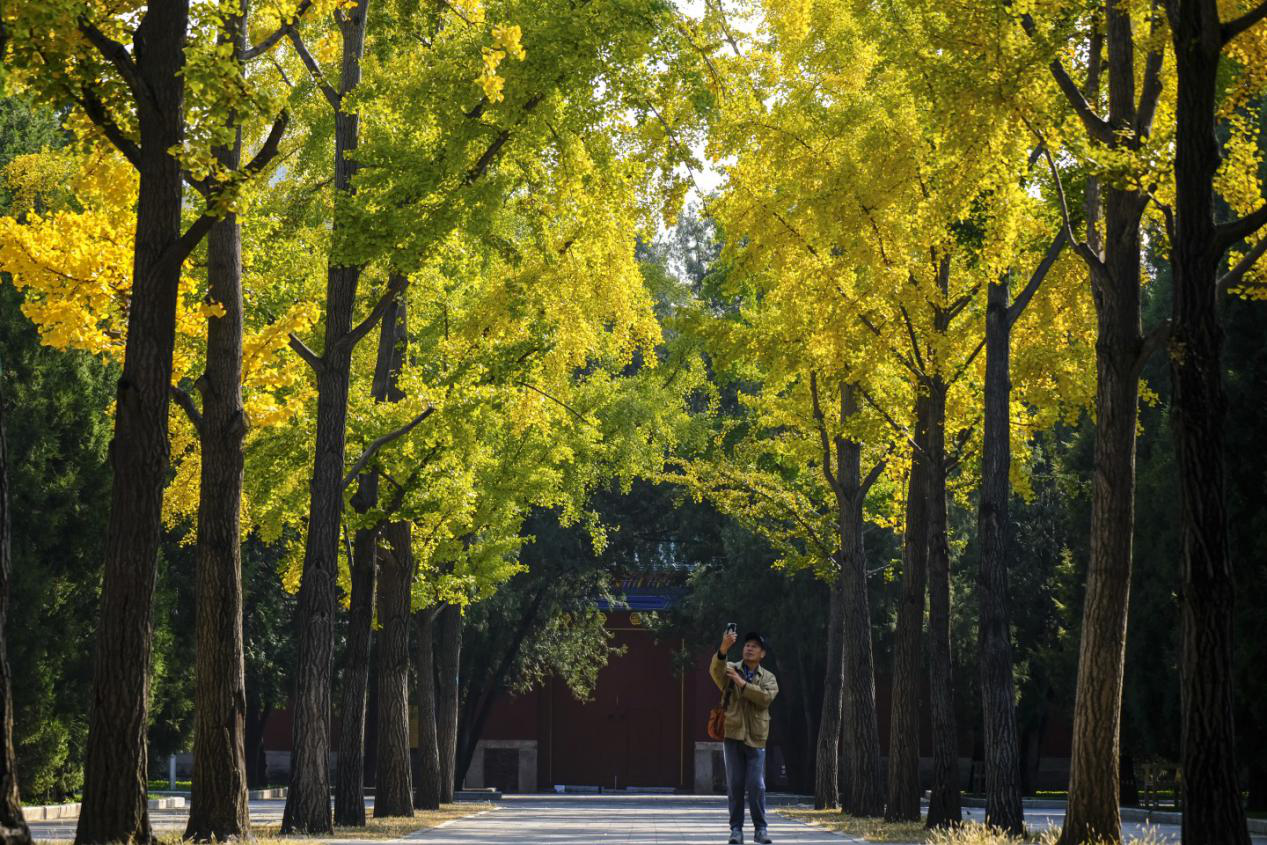 2018年10月18日,地坛公园,随着气温降低,银杏叶逐渐变黄,成为了秋天里的一道风景。图为路过市民驻足拍摄。 新京报记者 王子诚 摄
