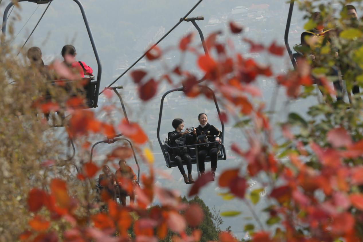 2018年10月20日,香山公园,游客在缆车上俯瞰山腰上的红叶林。新京报记者 侯少卿 摄