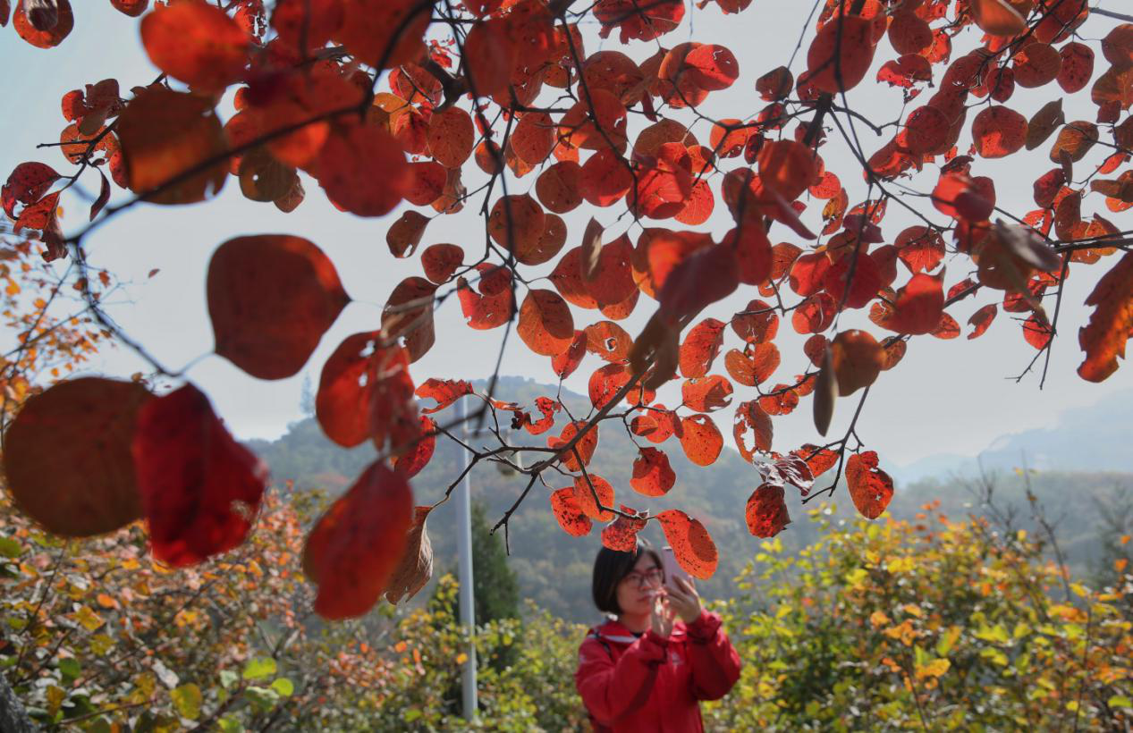 2016年10月13日,八达岭国家森林公园中,一位红衣女孩在红叶下赏秋。新京报记者 薛珺 摄