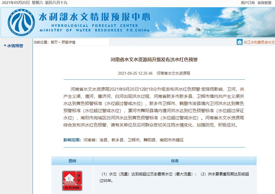 据央视新闻消息,据河南省水利部水文情报预报中心,河南省水文水资源局2021年9月25日12时18分升级发布洪水红色预警:受降雨影响,卫河、共产主义渠、澧河、惠济河、白河出现洪水过程,河南省新乡市新乡县、卫辉市境内共产主义渠洪水达到黄色预警标准(水位超过警戒水位),新乡市卫辉市、鹤壁市浚县境内卫河洪水达到黄色预警标准(水位超过警戒水位),漯河市舞阳县境内澧河洪水达到红色预警标准(水位超过保证水位),南阳市宛城区白河洪水达到黄色预警标准(水位超过警戒水位)。河南省水文水资源局综合发布洪水红色预警,请有关单位及沿河群众密切关注雨水情变化,加强防范,积极应对。