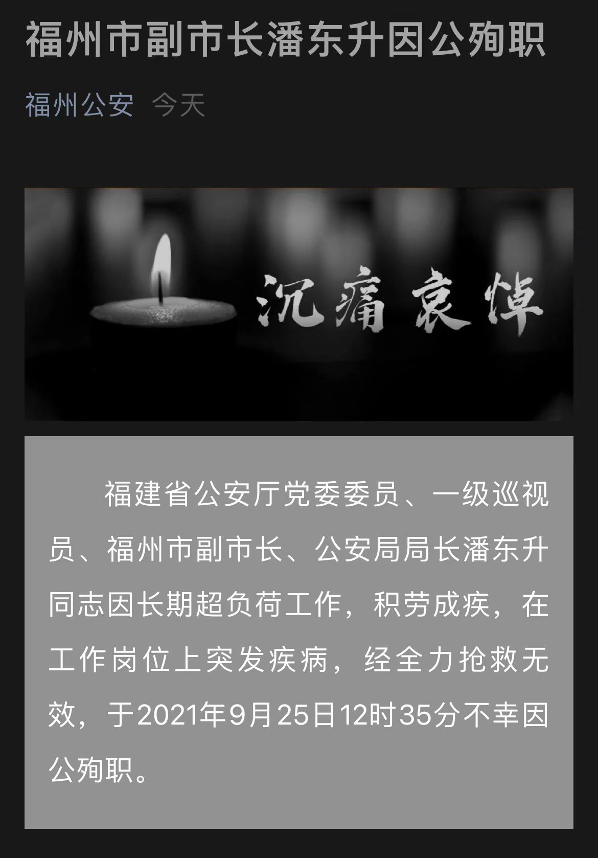 新京报快讯 据福州市公安局官方微信公众号消息,福建省公安厅党委委员、一级巡视员、福州市副市长、公安局局长潘东升同志因长期超负荷工作,积劳成疾,在工作岗位上突发疾病,经全力抢救无效,于2021年9月25日12时35分不幸因公殉职。