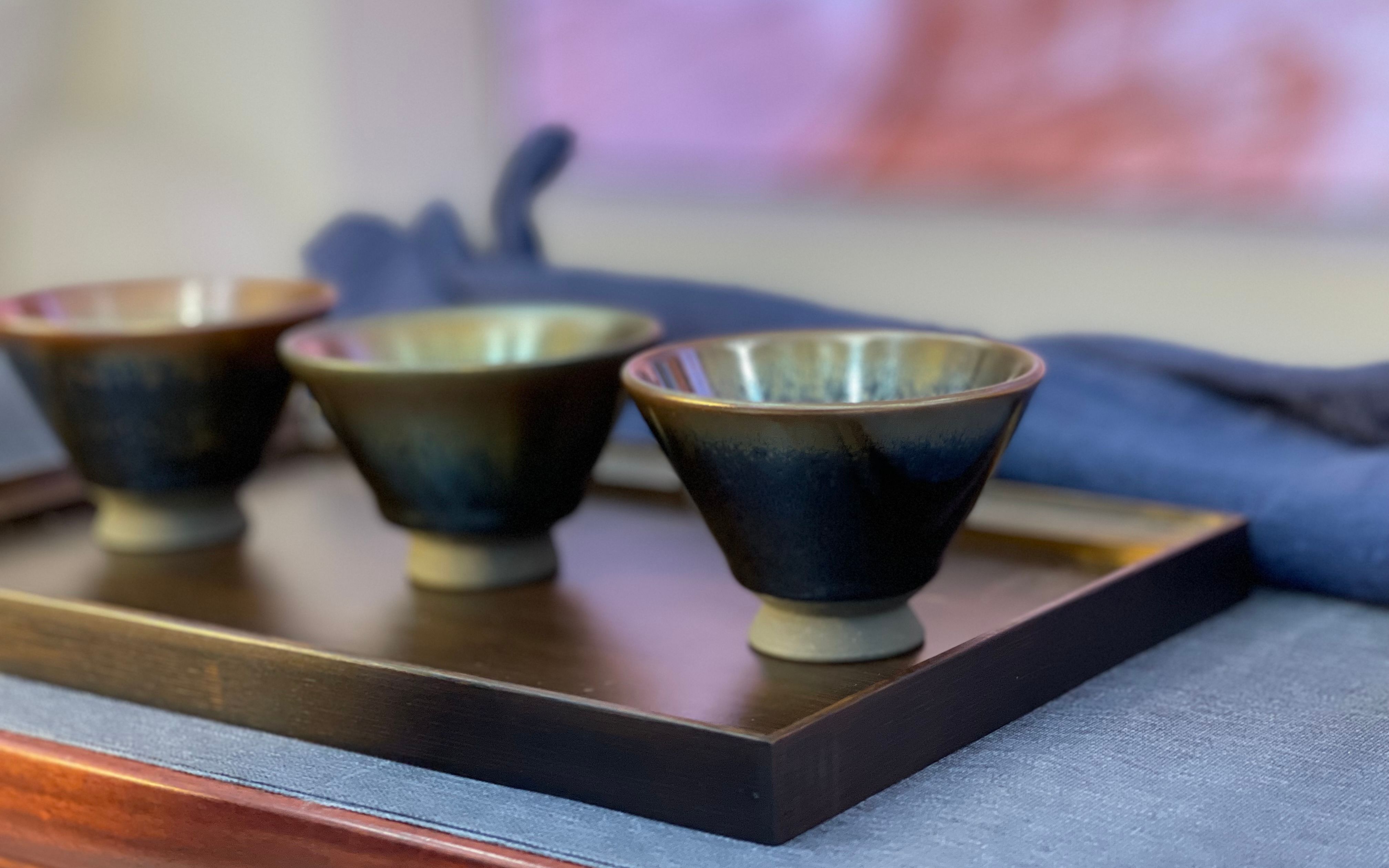 冬奥官帽茶盏口径约8厘米,高约6厘米,造型复刻传统建盏束口器型,古朴大气,底部刻有北京2022年冬奥会会徽。茶盏制作高度还原宋代建盏工艺,以铁矿石为原材料,使用单一矿石入釉烧制,釉面自然天成。