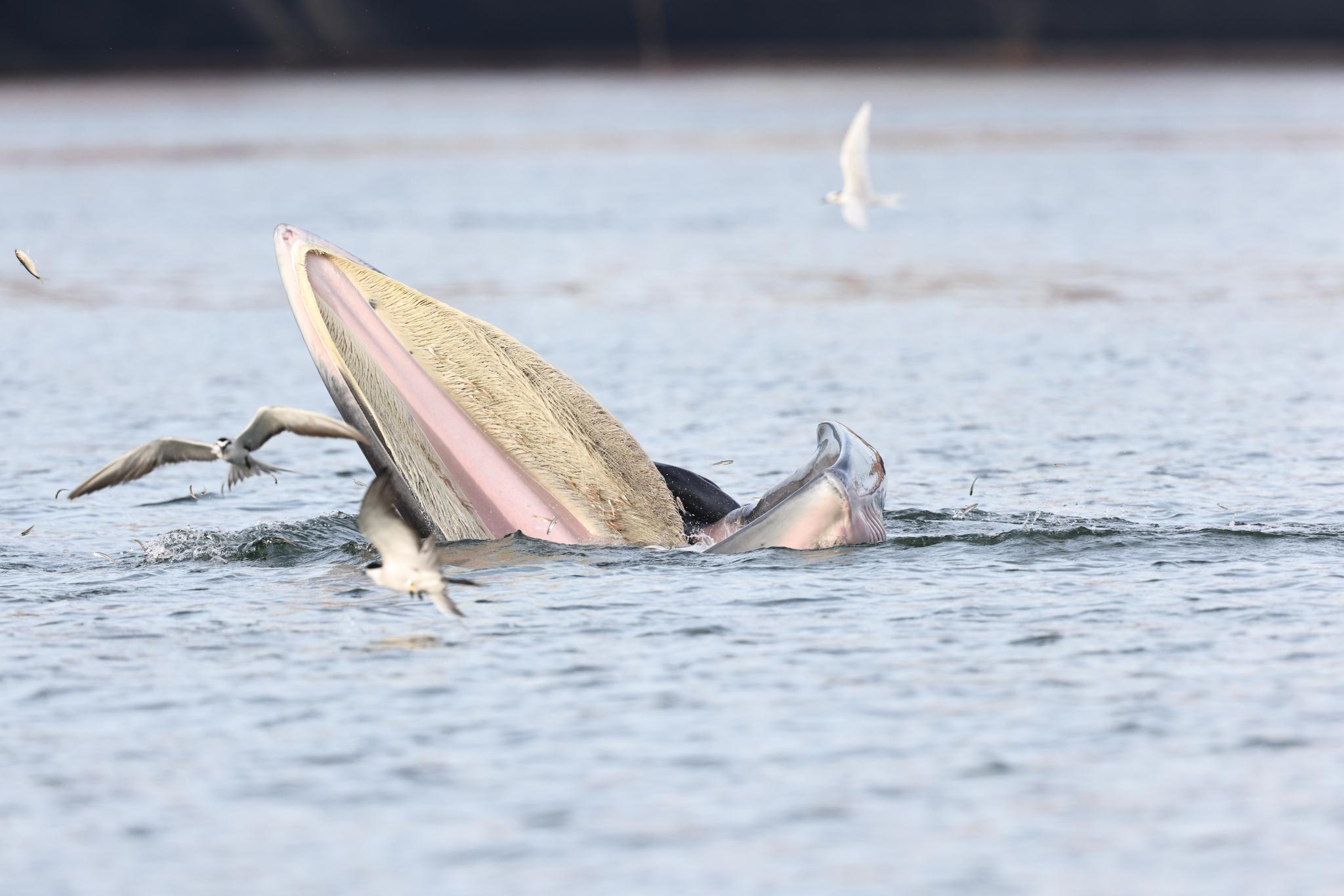 喷气、捕食、翻身、露背。黑色的巨型“马桶盖”在海面上打开,鱼群吸进去,海水吐出来,白色的燕鸥盘旋在上方,迟迟不肯飞走。